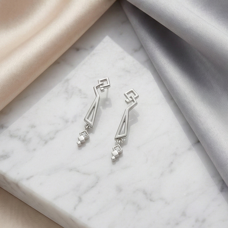 Crafted in certified 925 sterling silver, the Axiom Drop Earrings feature sharp geometric lines balanced with a subtle stone accent for refined contrast. Sculptural yet lightweight, they bring modern elegance to everyday styling and elevated occasions alike.